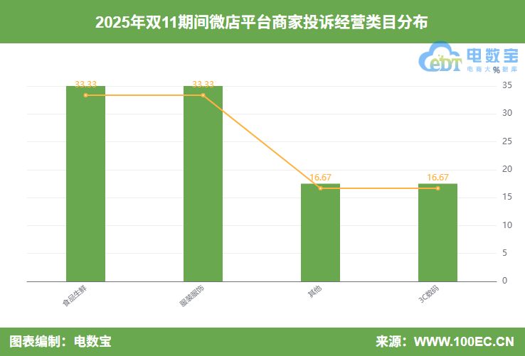双11期间,赞扬微店平台的商家运营类目顺次为食物生鲜(33。33%)、服拆服饰(33。33%)、其他(16。67%)、3C数码(16。67%)。