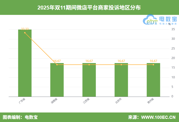 双11期间,赞扬微店平台的商家注册地域顺次为广东省(33。33%)、湖南省(16。67%)、江苏省(16。67%)、市(16。67%)、贵州省(16。67%)。