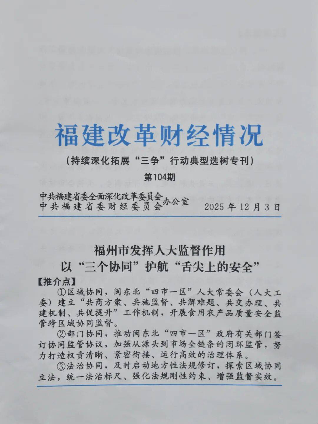 近日,《福州市阐扬监视感化 以“三个协同”护航“舌尖上的平安”》入选省委“三争”步履典型选树案例,正在省委办《福建财经环境》(持续深化拓展“三争”步履典型选树专刊)刊发推介。本年,福州市常委会深切贯彻落练习总正在福建调查时的主要讲话,按照市委持续深化拓展“三争”、开展“奋怯抢先”步履要求,以系统不雅念谋划推进实践立异,聚焦食用农产质量量平安监督工做,强化区域协同,牵头组织闽东北“四市一区”开展联动监视;强化部分协同,协调各相关部分全财产链发力;强化协同,推进监视和立法齐头并进,为守护人平易近群众“舌尖上的平安”、深化闽东北协同成长区交换合做贡献力量。